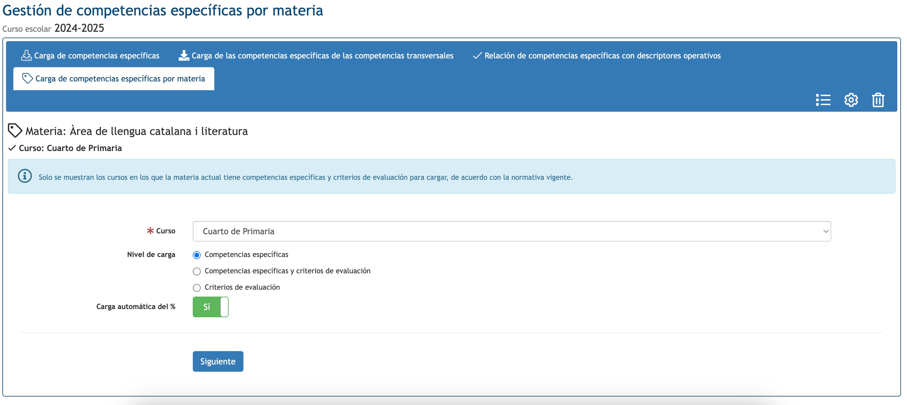 Desde el menú Materias > seleccionar la materia deseada > Evaluar. A continuación, abrid el desplegable Acciones > Gestión de competencias específicas.